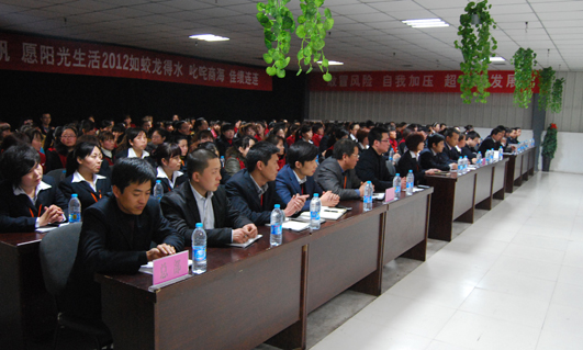 大会由集团公司行政总监孙俊峰主持,集团公司董事长李彤、总经理林振明、执行总经理邢斌、副总经理兼合阳店总经理杨三忠、财务总监杨慧英以及各门店负责人出席大会;参会人员有集团公司各门店管理干部、受表彰的先进集体、先进个人代表和优秀促销员代表共计160人。参会员工在领队带领下有秩序地依次入场,参加一年一度的阳光盛会,全体参会人员齐唱了《阳光生活之歌》后,在一阵热烈的掌声中,“阳光生活二0一二年工作会议”拉开帷幕。